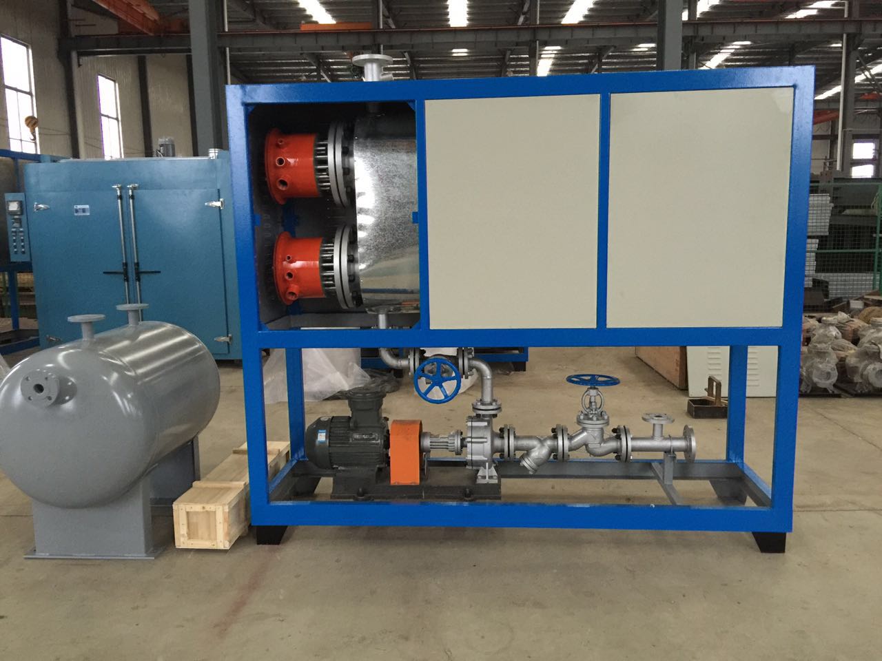 導(dǎo)熱油爐排氣流程: 1、導(dǎo)熱油通過膨脹槽注油口處加注,并通過膨脹口管道流入設(shè)備及油爐本體內(nèi),此時(shí)注油時(shí)一定要打開系統(tǒng)中所有的閥門(放油閥除外),讓導(dǎo)熱油流入筒體及需加熱設(shè)備內(nèi)。 2、當(dāng)液面顯示約為膨脹槽高度1/2時(shí),停止注油。 3、首 行常溫排氣:接通電源,打開導(dǎo)熱油加熱器的進(jìn)出口閥門及排氣閥(膨脹管道閥門需一直開著以及時(shí)補(bǔ)充油量),按動(dòng)油泵啟動(dòng)按鈕,油泵運(yùn)行,油泵應(yīng)按箭頭指示方向正常運(yùn)行,壓力表壓力顯示在規(guī)定范圍內(nèi),視聽油泵運(yùn)行情況,如有異常現(xiàn)象應(yīng)立即停機(jī)檢查,將故障排除后再重新起動(dòng)油泵,進(jìn)行常溫下排氣,直至壓力表指示穩(wěn)定。進(jìn)行常溫排氣時(shí),要注意觀察膨脹槽內(nèi)的液位,當(dāng)?shù)陀谝?guī)定的液位高度時(shí)要及時(shí)進(jìn)行補(bǔ)充。 4、升溫脫水:在確認(rèn)常溫下運(yùn)行正常后,即可進(jìn)行升溫脫水排氣(操作前詳閱導(dǎo)熱油使用說明書及溫控儀使用說明書),升溫脫水排氣可按如下步驟進(jìn)行: 步:升溫至100-120℃保溫 開始升溫時(shí),應(yīng)該控制升溫速度在50℃/h以內(nèi),并且監(jiān)視壓力表顯示是否正常,如發(fā)現(xiàn)無壓力或壓力不穩(wěn),說明系統(tǒng)內(nèi)仍有殘留氣體,此時(shí)要求按3要求重復(fù)進(jìn)行常溫排氣操作,待系統(tǒng)壓力穩(wěn)定后方可繼續(xù),升溫至120℃后進(jìn)行長(zhǎng)時(shí)間保溫,保溫時(shí)間的長(zhǎng)短與系統(tǒng)總?cè)萘考皩?dǎo)熱油的質(zhì)量有關(guān)。  第二步:升溫至150-180℃保溫。  排除油中輕組分、揮發(fā)物及殘余水分,請(qǐng)參照KRD系列導(dǎo)熱油加熱器系統(tǒng)脫水排氣曲線圖操作 第三步:脫水排氣完成后要關(guān)閉排氣閥(其它閥門無需關(guān)閉),投入正常升溫運(yùn)行。 5、 升溫脫水排氣過程有關(guān)事項(xiàng)。 升溫過程中管路可能會(huì)發(fā)出碰擊的響聲,說明系統(tǒng)內(nèi)有大量氣體或管道不暢,此時(shí)要降低升溫速度,待氣體排除便可消除聲響;如系管道不暢所至應(yīng)予以排除。 脫水排氣過程可能會(huì)有大量氣體涌入膨脹槽,造成槽內(nèi)導(dǎo)熱油外溢,操作前要在溢油管下安置好溢油容器。 進(jìn)行脫水排氣時(shí),現(xiàn)場(chǎng)必須有人員看守,發(fā)現(xiàn)異常及時(shí)處理。   對(duì)于所提的油泵無油或少許油流出的問題,解決方案如下: 1、 關(guān)閉出油口閥門,啟動(dòng)油泵,觀察壓力表顯示情況,若無壓力,則說明回油口無油補(bǔ)充油泵,使得油泵空轉(zhuǎn),無后續(xù)油及時(shí)補(bǔ)充,則請(qǐng)貴司檢查一下回油口的供油情況,此時(shí)請(qǐng)確保膨脹槽里有油并膨脹管道閥門打開和需熱設(shè)備有油并出油口閥門在打開狀態(tài)。 2、 如果以上要求都執(zhí)行到位,壓力表還無壓力,請(qǐng)檢查油爐上的油泵、截止閥及過濾器是否堵塞。 3、 若壓力表顯示壓力值,而油泵、截止閥及過濾器并無堵塞,那油爐的出油口一定會(huì)按油泵所提供的流量進(jìn)行流出。